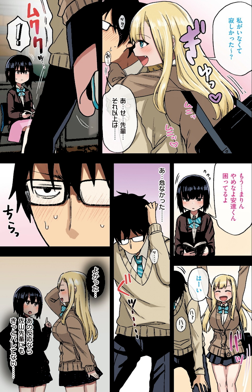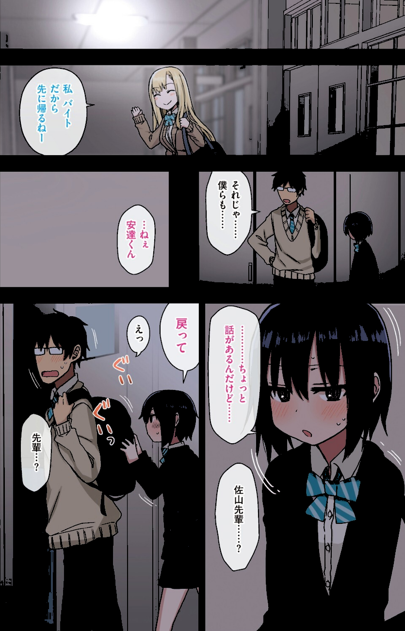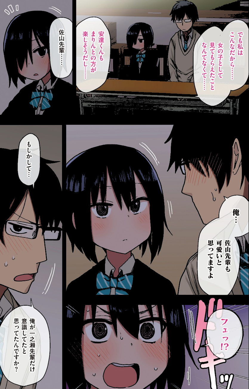 まりんに勃起していた事実に対し自分には魅力がないなどと勘違いしている佐山先輩に安達は、