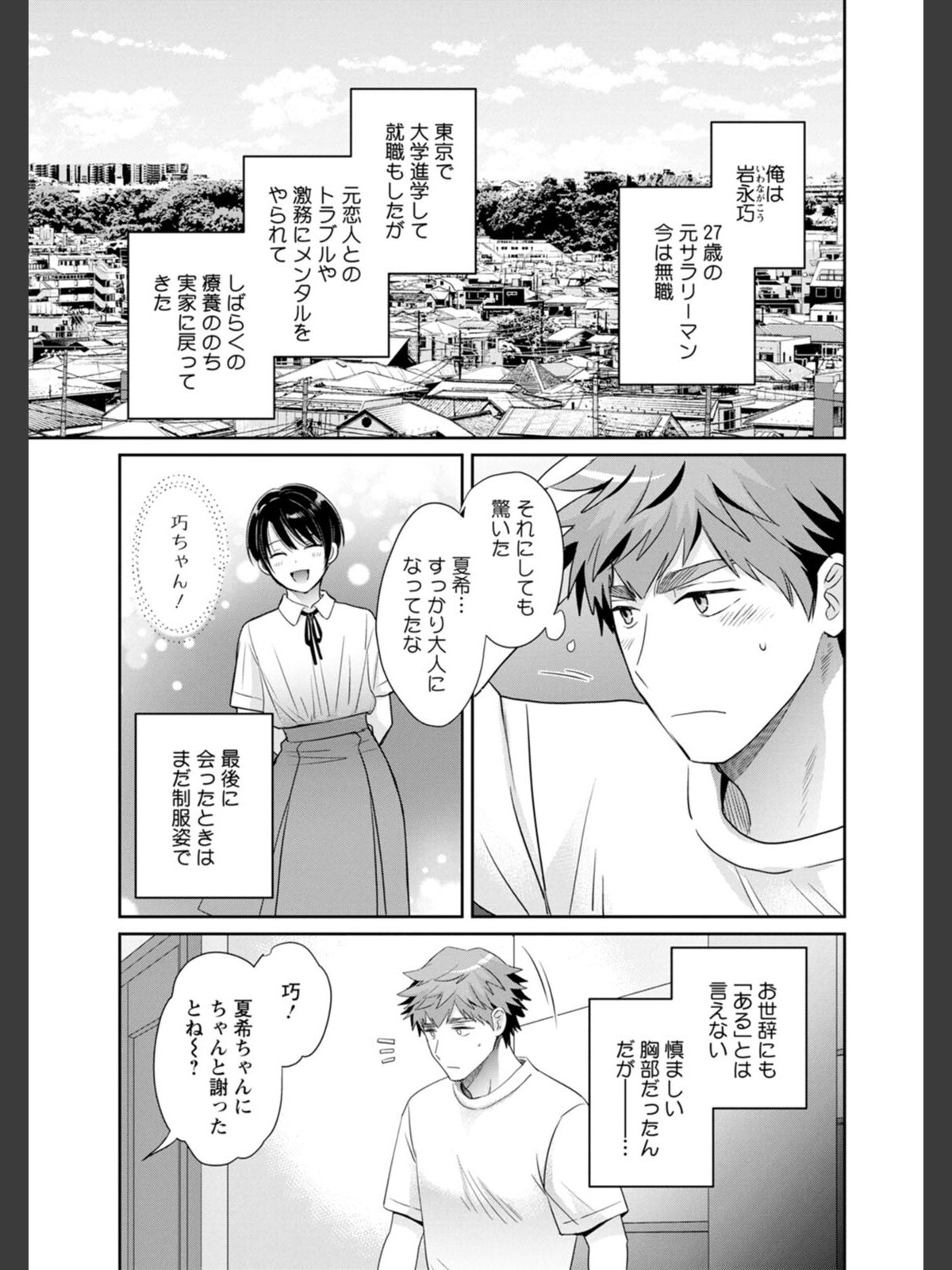 お前のことは弟以上には見れない…だって、つるんぺたんだったんだもの! 虫取りやかくれんぼ、およそ兄弟みたいに一緒に育ってきた「花邑夏希」と頑張ってきた育乳の成果がとんでもなかった! Aカップ未満だったおっぱいが、7年見ないうちにぼいんぼいんになってしまったんだ! …空白期間に何をしていたんだ「岩永巧」! おっぱいビフォーアフターの匠、もとい巧の明日はどっちだ!?