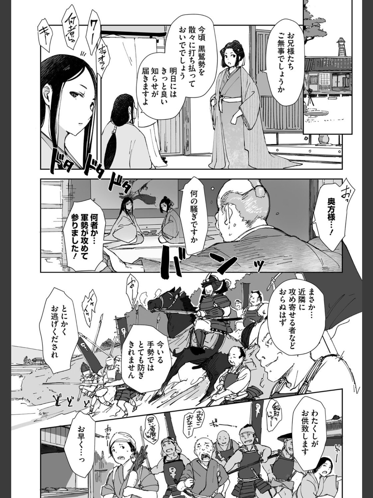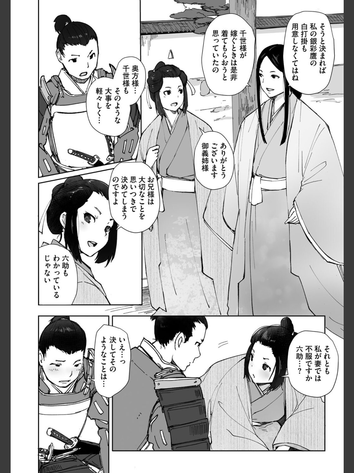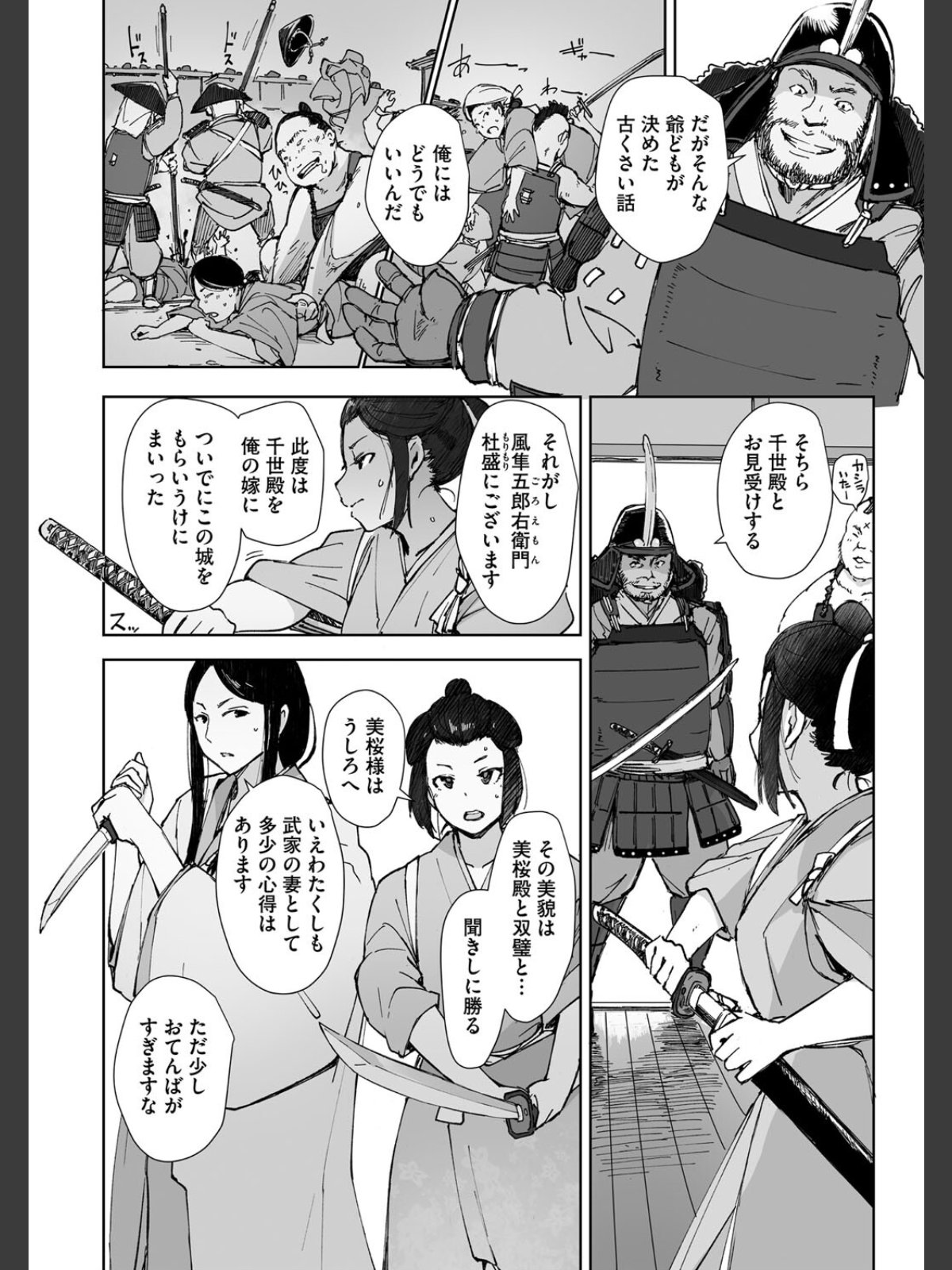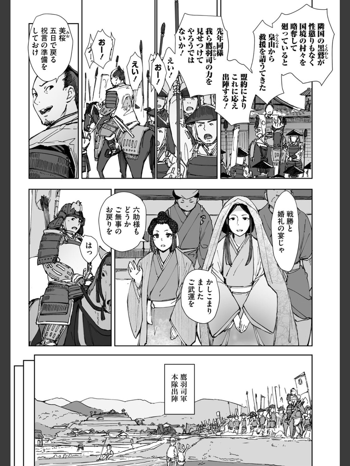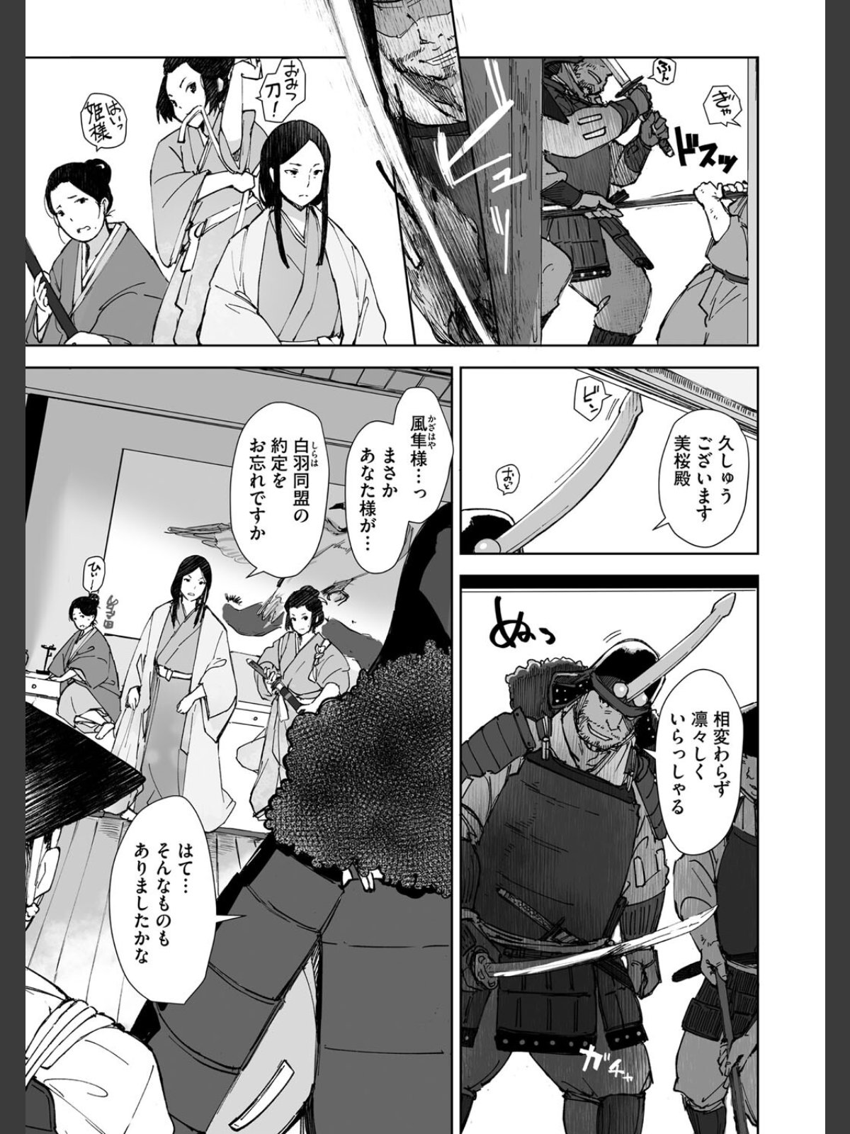 時は戦国…武将・風隼杜盛は、音羽城主・鷹羽司眞綱の留守を狙い城に攻め込む。野心もあったが、それ以上に眞綱正室・美桜とその娘・千世の美貌を知り、己の獣欲に突き動かされたためでもあった。首尾よく美桜と千世を捕らえた杜盛は、滾る性欲に突き動かされるまま、美しい戦国姫を凌●し始める。薄明かりの中、白く艶めかしい肌を下種の魔羅に汚され、望まない絶頂を繰り返す美桜と千世。だが、彼女たちは誇りを捨ててはいなかった―――。