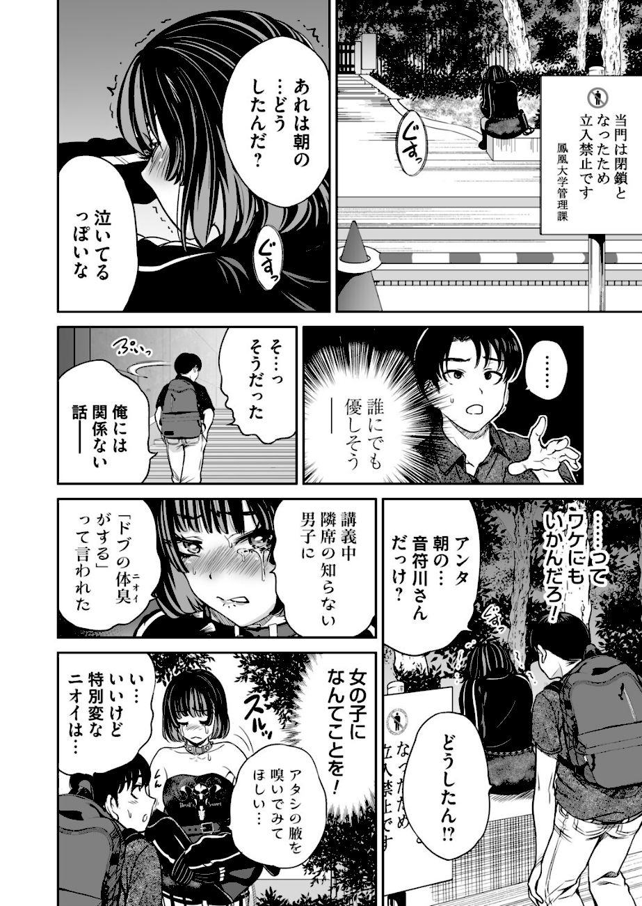 音楽サークル所属で脇が綺麗なメッシュの女子大生。校内すら円と二人きりになれる場所はもうない。講義終わり学食に向かっていると、ひとり泣いてる鳴を見かける。流石に放っておくわけにもいかず声をかけると、どうやら隣の男子に臭いと言われたらしい。