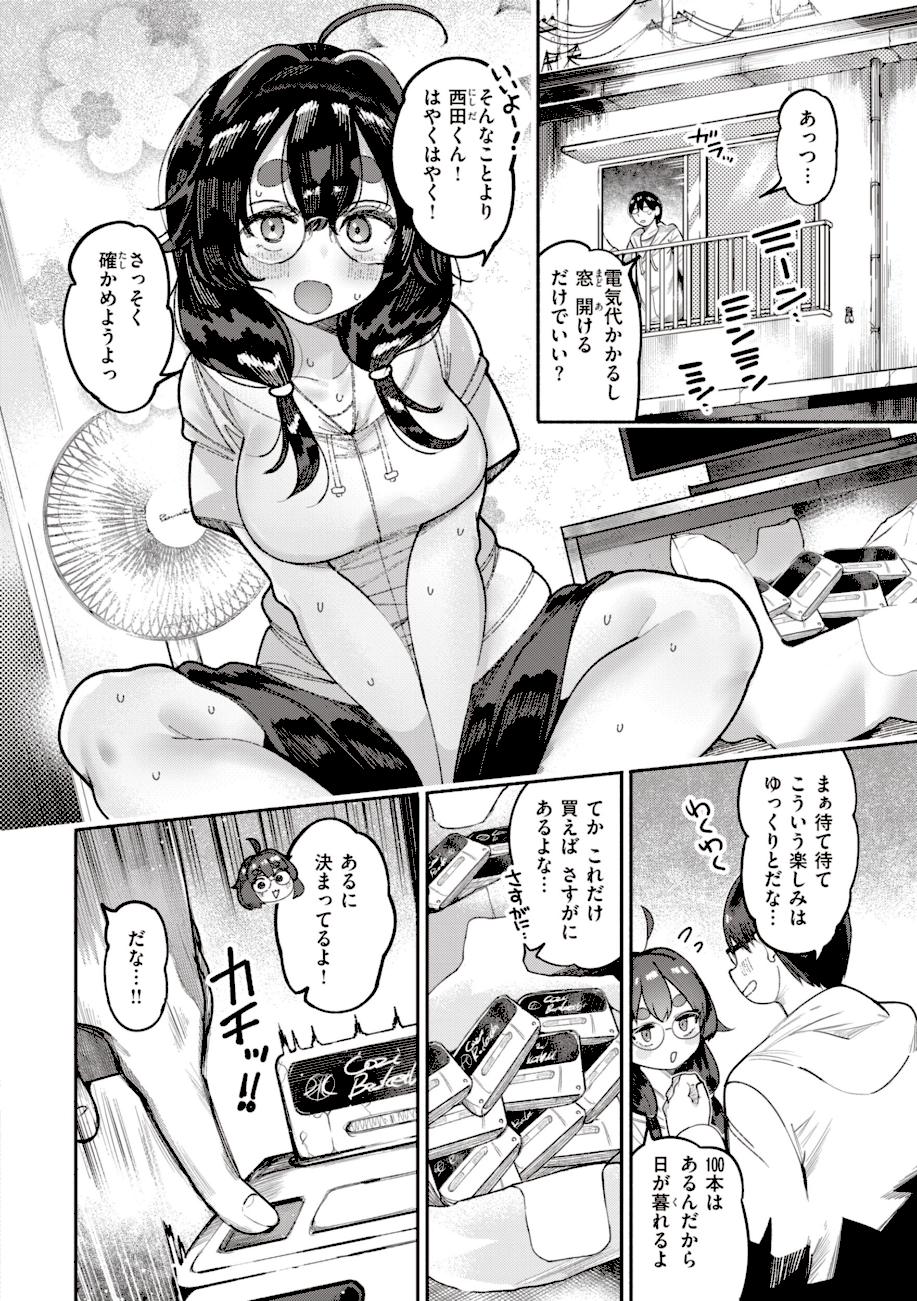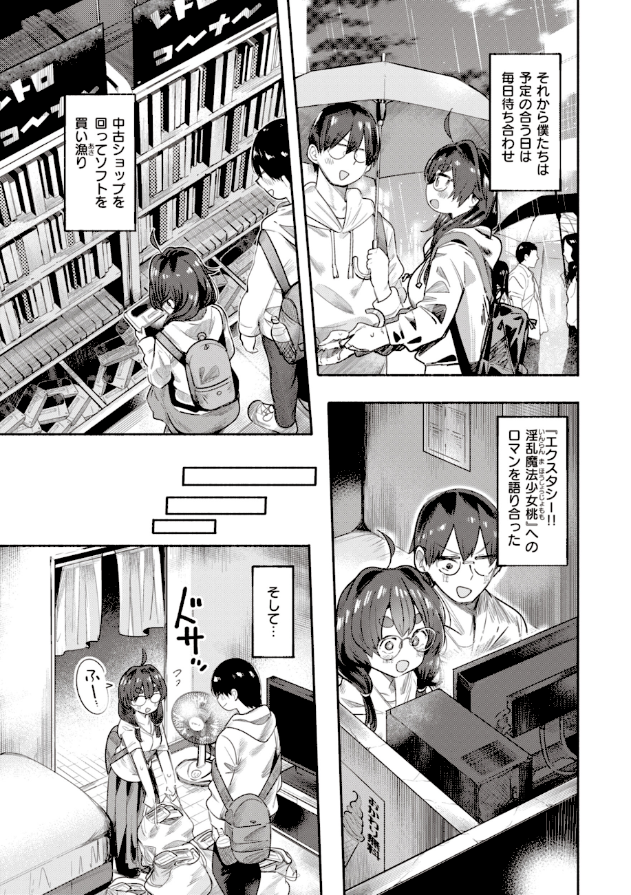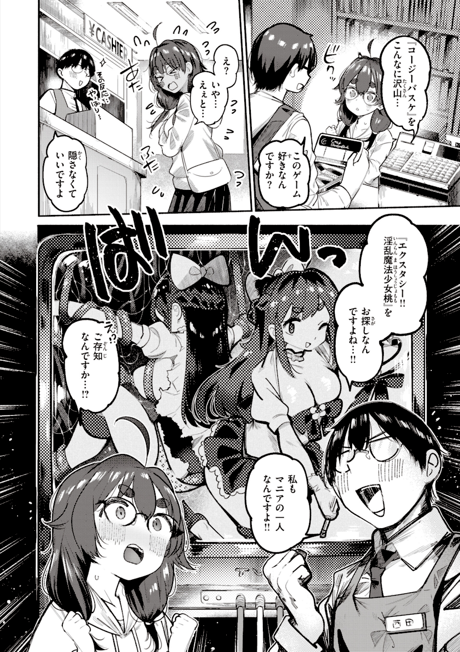 売れ残りのゲームカセットに隠された伝説のエロゲ《エクスタシー!! 淫乱魔法少女桃》を探す中で出会った西田(にしだ)と朝日(あさひ)。100本以上のカセットの中からついに《桃》を見つけた二人は興奮のあまり……♪