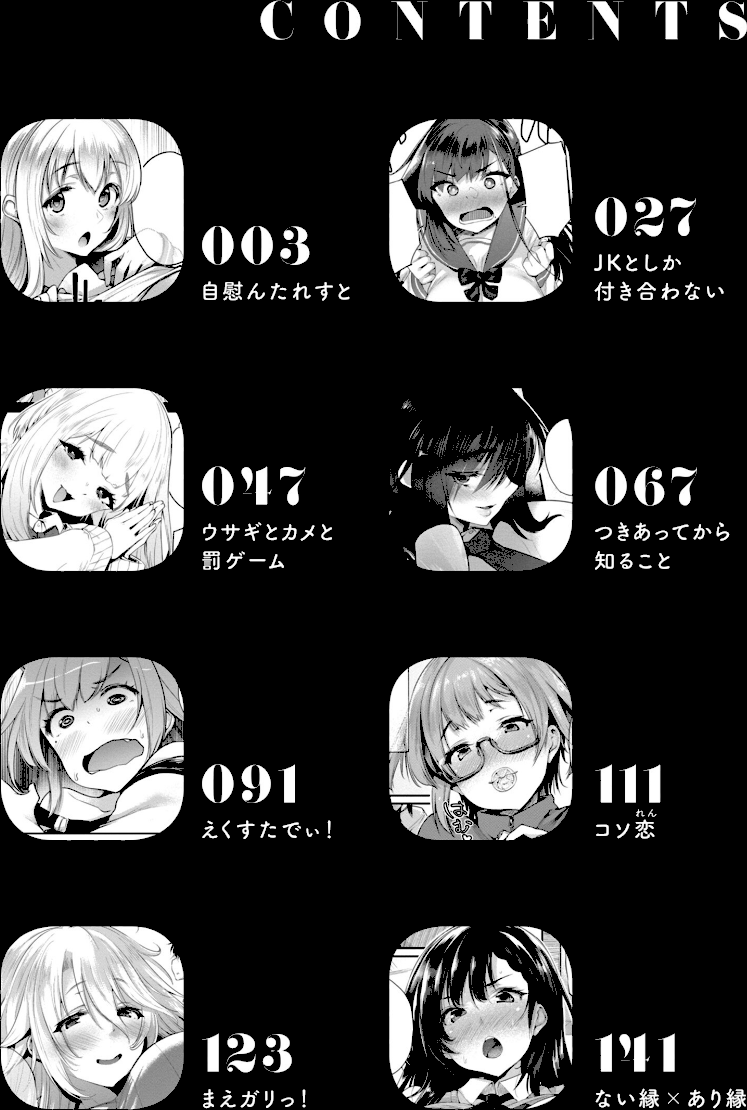 同級生からオカズの提供!? 興味津々な女のコにオナニーを観察される『自慰んたれすと』をはじめ、シちゃったら好きになっちゃう!? チョロ可愛いJKたちが満載の全8編を収録!!